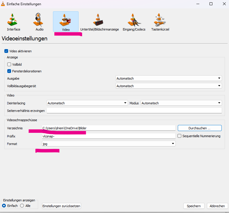 Bevor du einen Videoschnappschuss erstellst, musst du das Speicherverzeichnis und das Dateiformat festlegen.