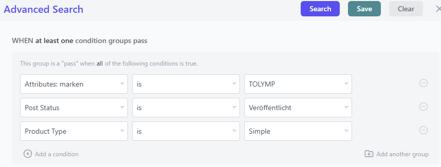 Bulk Edit Run Now startet den Vorgang für alle zuvor selektieren Produkte der Marke TOLYMP