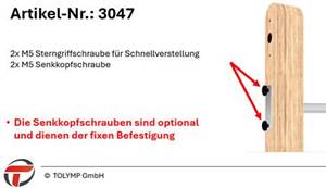 2x M5 Sterngriffschraube für Schnellverstellung 2x M5 Senkkopfschraube |