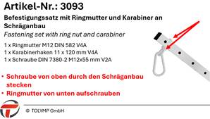 Befestigungssatz mit Ringmutter und Karabiner an Schräganbau |