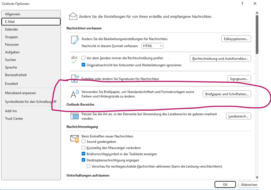 Die Standard-Schriftart ist Aptos. Die Schriftgröße ist 12. Diese ist von jedem Mitarbeiter zu nutzen. (Im Outlook: Datei – Optionen – E-Mail – Briefpapier und Schriftart – sowohl bei Antworten als auch bei Neue Nachricht)