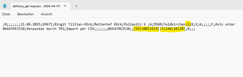 Die gerade erzeugte CSV-Export-Datei aus dem Ordner Downloads mit dem Editor öffnen. Hier können die Ladeinfos entsprechend nachgetragen werden: