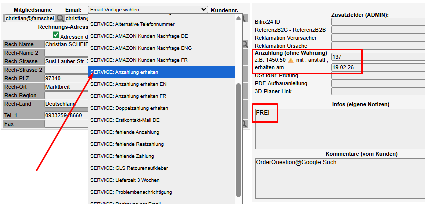- Dem Kunden eine Bestätigungsmail (SERVICE: Anzahlung erhalten) schicken ACHTUNG: sollte ein Auftrag geparkt (also lila) sein, bitte vor dem Versand der Bestätigungsmail mit dem Kollegen Rücksprache halten, der den Kunden/ Auftrag betreut, ob eine Bestätigungsmail rausgeschickt werden darf oder nicht.